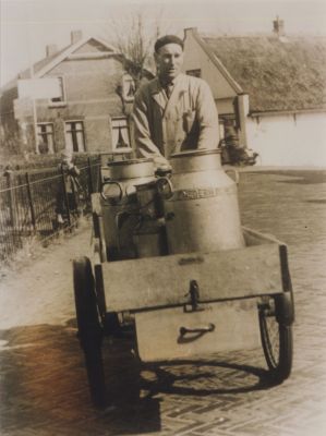 | Omschrijving: | Willem Hoetmer op de bakfiets. Hij had een melkhandel in Overmeer en ventte elke dag met zijn zuivelartikelen langs de klanten. Zijn winkel stond op de Vreelandseweg. Hier zit (anno 2009) een kapper. |